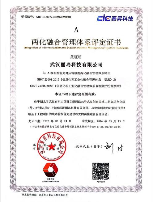 ? ?近日,武漢麗島科技有限公司順利通過《信息化和工業化融合管理體系要求》(GB/T 23001-2017)及《信息化和工業化融合管理體系新型能力分級要求》(GB/T 23006-2022)認證審核,榮獲A級兩化融合管理體系評定證書,標志公司數字化轉型邁上新臺階。